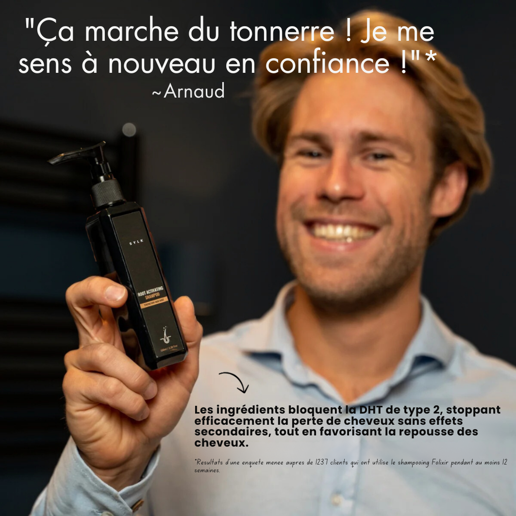 Formulé pour cibler le DHT, Folixir stoppe la chute dès la racine. Moins de cheveux dans la douche, plus de densité visible au sommet du crâne et sur les tempes dès 6 semaines.