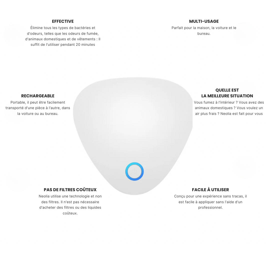 Rechargeable, compact et design, Néolia vous accompagne partout : voiture, salon, dressing. Il élimine les odeurs à la source sans laisser de trace ni de parfum artificiel.