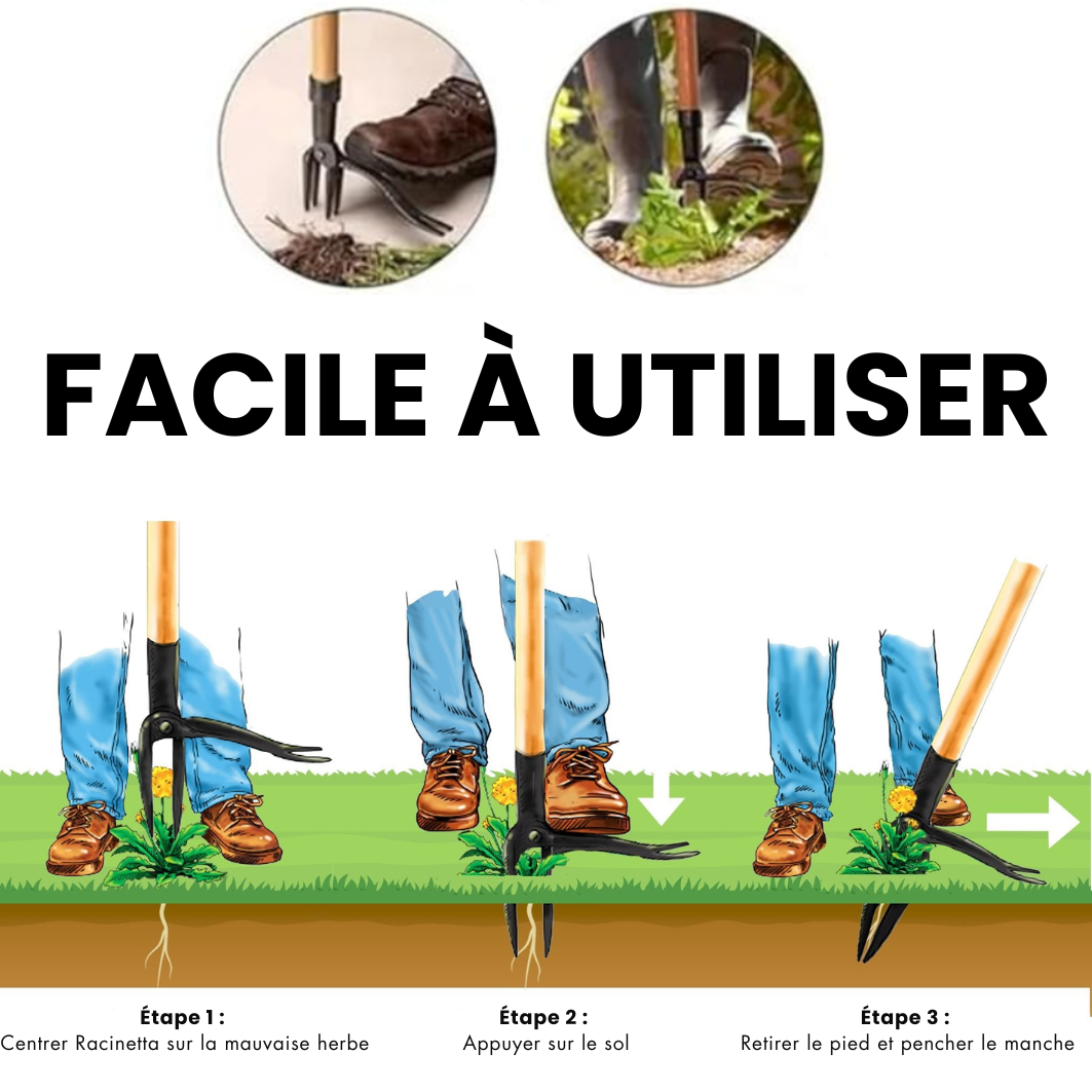 Éliminez les mauvaises herbes sans vous pencher ni forcer. Racinetta arrache la racine sans chimie ni mal de dos. Votre jardin reste propre, et votre dos aussi !